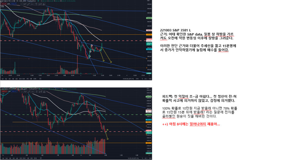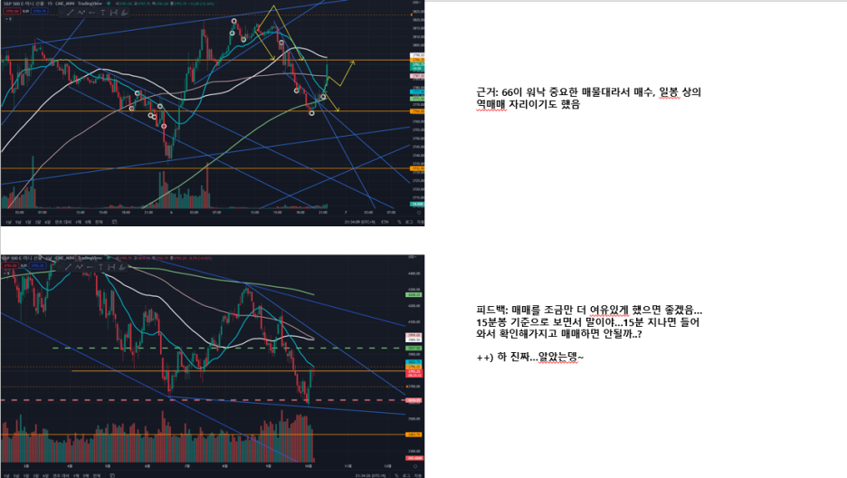 그리고 천장에서 매도한 계약을 살짝 성급하게 커버한 감이 없지 않아있는데, 이는 15분봉 위주의 매매를 하면서 차트를 너무 쓸데없이 자주봐서 심리가 흔들려 그렇게 된 것 같다는 피드백까지 얻을 수 있었다.